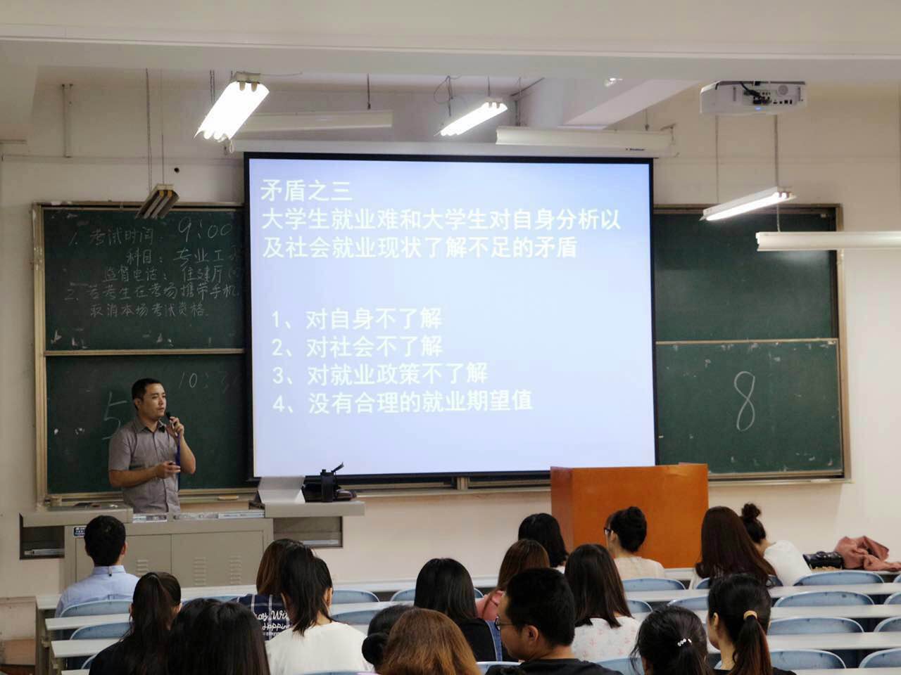 在会议中,李主任不断提醒大家多从环境中的合理一面去对待工作岗位与自己理想的工作岗位中实际的差异,为应届毕业生摆正心态,积极进取,未来升职提出了 一些可行性提议。“世界上没有两片相同的树叶,我们人也是一样。”李主任建议我们做一份职业测评,正确认知自身的长短板,理性选择适合自己的职业。随后, 李主任以“只要是人,就会找到工作”小结了本次讲座,希望应届毕业生可以积累一些面试求职的经验,为将来真正的面试打下基础。最后,李主任列举出52书库 毕业 生在求职中存在的问题以及推荐了一些招聘信息获取的渠道。李主任用丰富的学生案例,生动的表述,简明的图表,热情的态度感染了在场的每一个人,讲座现场频 频报出热烈的掌声与欢笑声。