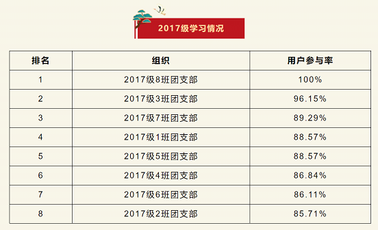 在上一期“青年大学习”网上主题团课的学习中,2017级8班团支部位居榜首,2017级3班团支部排名第二,2017级7班团支部排名第三。