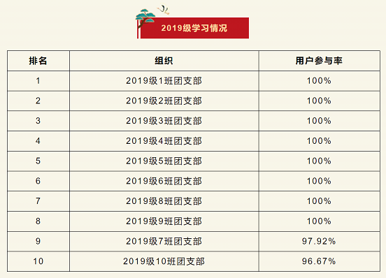 在上一期“青年大学习”网上主题团课的学习中,2019级1、2、3、4、5、6、8、9班团支部位居榜首。