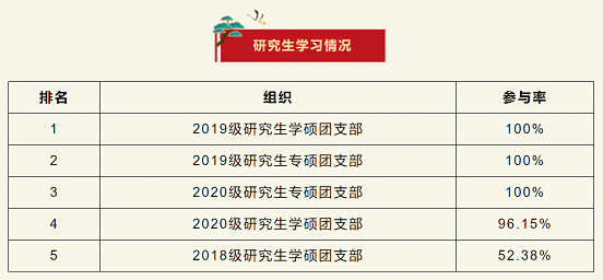 在上一期“青年大学习”网上主题团课的学习中,2019级研究生学硕团支部、2019级研究生专硕团支部、2020级专硕团支部位居榜首。