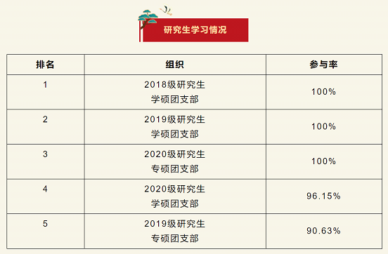 在上一期“青年大学习”网上主题团课的学习中,2018级研究生学硕团支部、2019级研究生学硕团支部、2020级专硕团支部位居榜首。