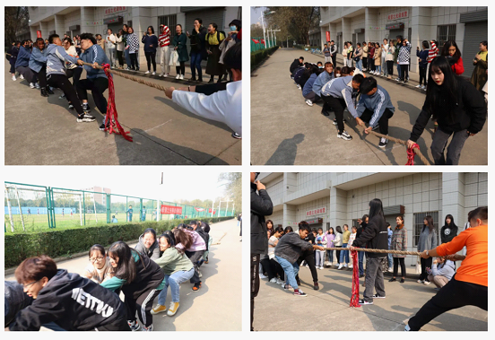 拔河比赛率先开展。哨音一响,同学们便铆足了劲儿,抱着必胜的决心投入“战斗”。围观的同学们也高声为本班同学呐喊助威,场面一度十分热烈。