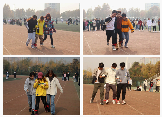 “三人四足”是掌声与欢笑齐飞的一场比赛。这不仅考验着同学们的耐心,更重要的是默契与凝聚力。大家你追我赶,齐头并进,倘若摔倒了,也是相视一笑,又抓紧投入了紧张的比赛中。伴着“一二一”的口号,笑着冲向终点。