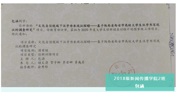 “汉字不仅仅是一种文化符号,更是中华民族古老智慧文化的载体,是人们社会生活和精神生活提高的必然手段。高等院校的优秀青年学子作为中国特色社会主义事业的建设者,中华民族优秀传统文化的继承者,对于实现中华民族的伟大复兴具有重要作用。基于此,对高等院校学生的汉字书写状况更应该给予重视,汉字书写的保护与传承势在必行。”在问及包涵为何会想到以汉字为出发点去策划这个项目时,她如是答道,“我们在刚开始只确立主题为汉字,但是具体方向一直没法确定。后来听取了俞老师的建议,将目光放至高校学生的汉字书写现状上,对此进行具体的调查研究。”因疫情原因,许多计划无法顺利实施,其中最大的困难就是项目后期没办法实地调查,只能通过线上交流来获取相关信息。后期实践差强人意,因此最开始包涵团队预计是省级立项,但是看到最终结果是国家立项时,团队成员又惊又喜。