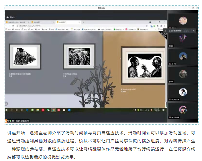 为了提高52书库 学生利用新媒体进行红色文化传播的技能,网络与新媒专业詹海宝老师于2021年8月2日18:00至20:00,在线上给同学们做了“基于滑动时间轴的交互式红色文化宣传作品创作”实践讲座。