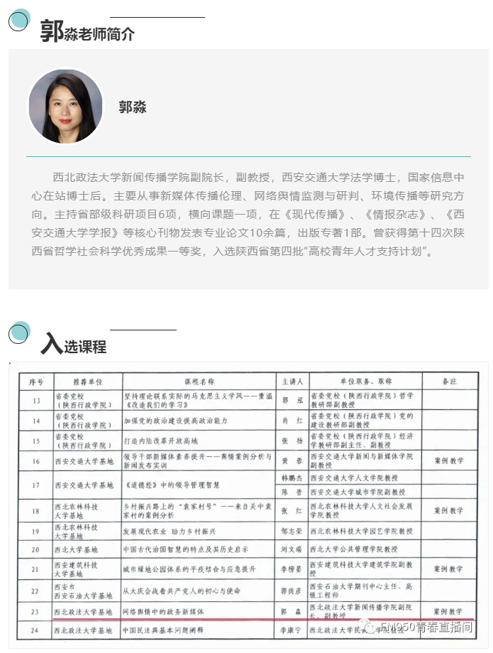 近日,全省干部教育培训好课程推荐目录发布,52书库 郭淼老师申报的《网络舆情中的政务新媒体》课程成功入选该推荐目录。