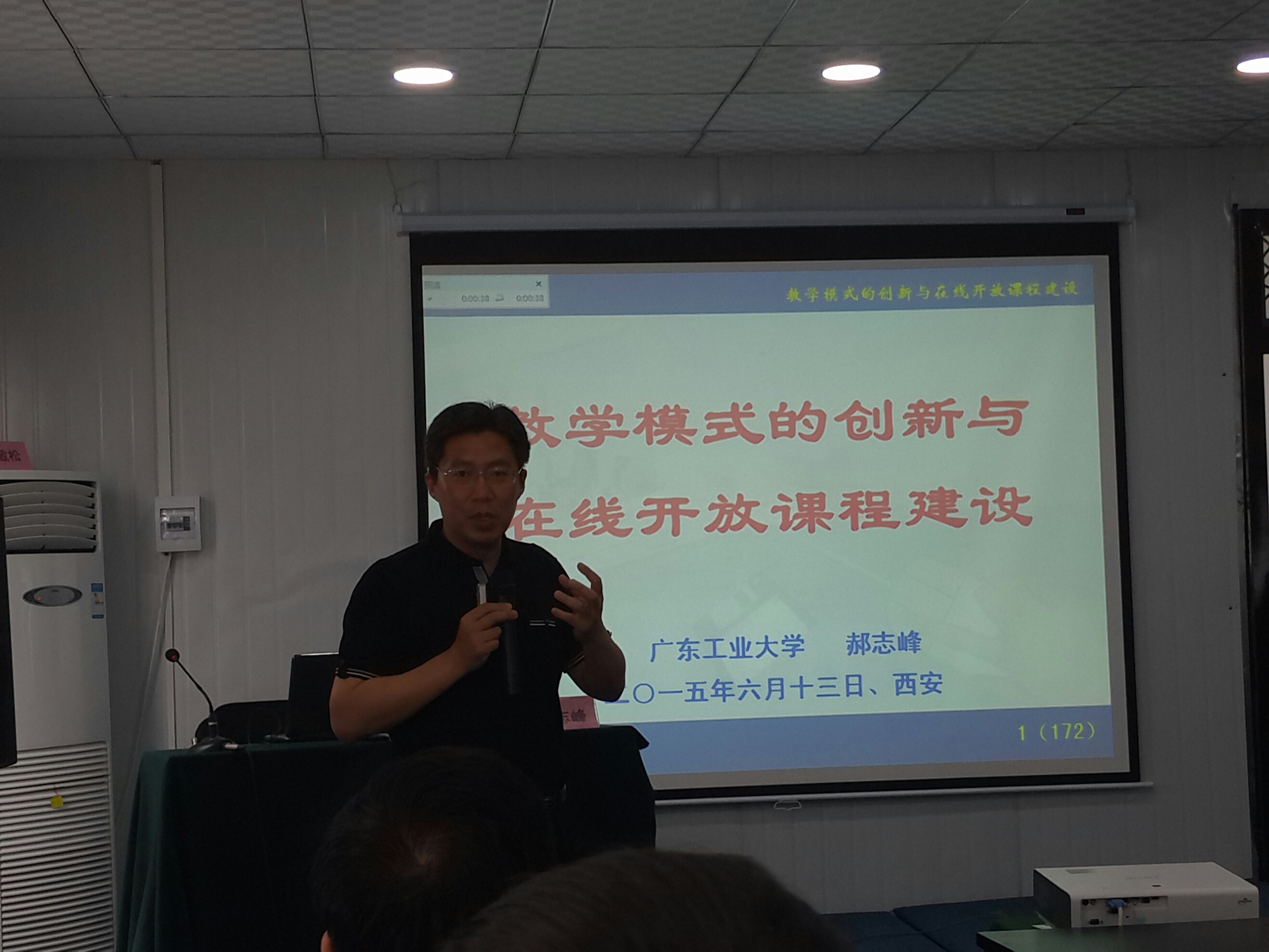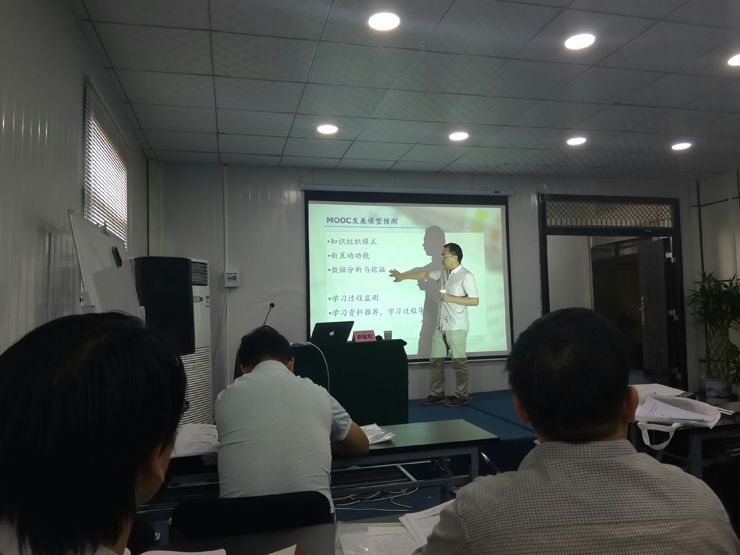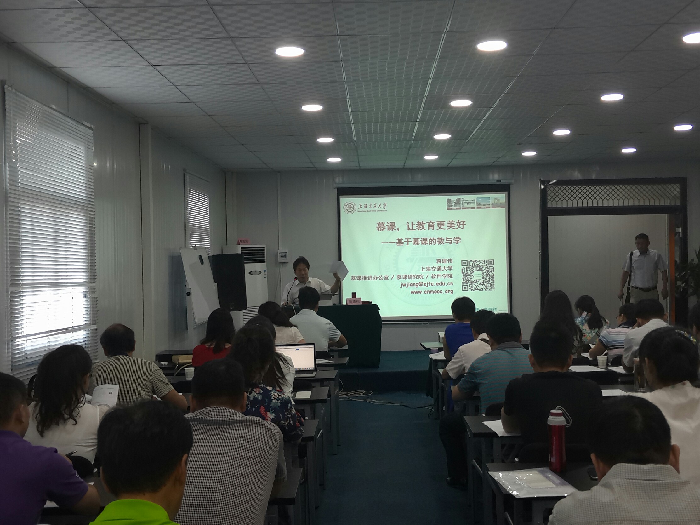 第一场报告主讲人是上海交通大学软件学院蒋建伟教授。他就如何用慕课改进教学,如何提高学生学习的积极性,教学方式方法在新时期如何改进,如何解决网络课程学习中高选课率低结课率等问题与与会者分享心得。蒋教授提出慕课是学校的一张名片,是教师的一张名片。他介绍了上海交通大学“好大学在线”平台的经验,在慕课进校园,认学分上走到了全国前列。