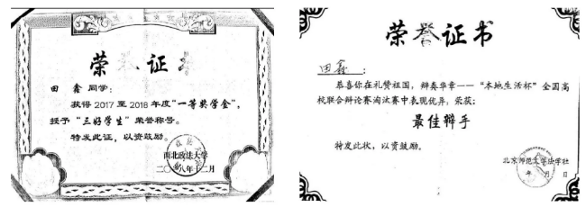 ▲田鑫获得的部分奖状