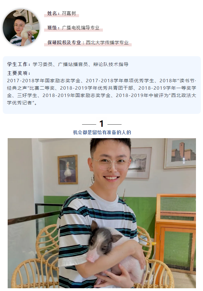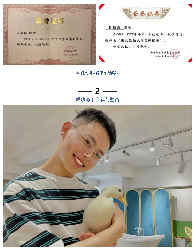 在学习或生活中遇到问题一定要学会倾诉,调整自己的心态,遇事有个好心态很重要。平时课余休息时间可以参加一点有益的比赛,社团活动等,这些对于丰富自己的阅历和实践经验都很有必要,但是千万不可以为了因为这些而耽误学习,参加比赛是一个加分项,但绝不是一个必备选项!初来乍到的我们可能会被各种社团活动绕的头晕目眩,学长提到最重要的一点就是推免需要早计划、早准备。越早计划,就可以拥有越多的时间为推免进行充分的准备,学习成绩也要尽自己最大努力去提高,毕竟我们在大学最主要的目的还是学习。此外,也要特别注重自己的综合加分项以及提升自己的逻辑思维和口语表达能力,因为,考研是对各种能力的考验。水滴石穿不是一天能达到的效果,考研推免也同样不能一蹴而就,这是一场持久战,需要我们拥有一颗满腔热血敢于拼搏的心和持之以恒与时间赛跑的毅力。在采访符嘉树学长的过程中,我受益匪浅,大家一定也感受到了学长想要传达的理念:脚踏实地朝着自己的目标奋进,努力让自己无懈可击!所有的成功都不是突然降临的,所有的努力都是有迹可循的,我们要向符嘉树学长看齐,踏实努力过好每一天,向着更美好的未来进发!最后祝学长前程似锦,岁月如歌!