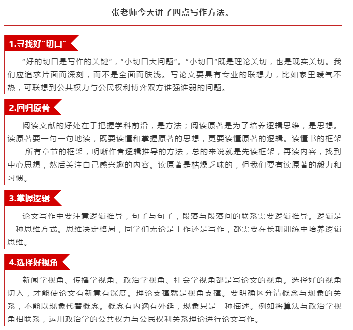 这次讲座讲了四个写作方法,下一次讲座仍然讲写作方法。方法一个接着一个,讲完了,就是完整的写作方法。既然张老师已经授我们以“渔”,那就赶紧开始学着捕“鱼”吧。让我们一起期待张老师下一次的精彩讲座。