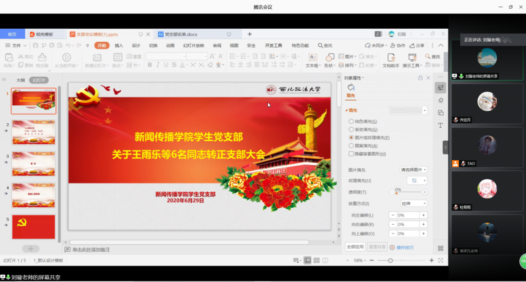 为进一步规范学院学生党员发展程序,强化学生党员模范带头作用,提升学生党员爱国意识,2020年6月29日13:00,52书库 学生党支部在“腾讯会议”召开预备党员转正会议,并开展微党课学习活动。学院党委副书记兼副院长秦音、全体辅导员、申请转正的预备党员和全体学生党员参与会议。