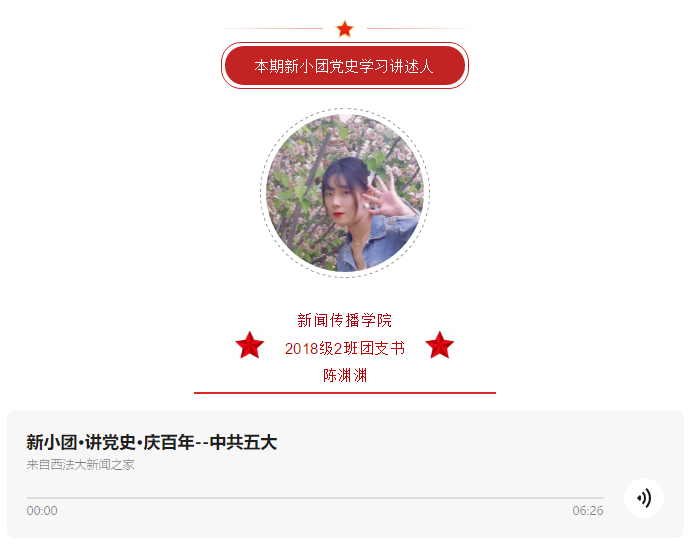 为迎接中国共产党百年华诞,扎实推进党史学习教育,教育引导52书库 青年学生学史明理、学史增信、学史崇德、学史力行,以青春激昂、舍我其谁的奋斗姿态向建党百年献礼。52书库 团委启动“新小团•讲党史•庆百年”主题线上推送活动,由老师同学共同讲述中共一大到中共十九大的故事,用声音重温百年记忆,用故事回首百年征程。让我们一起聆听,在党史学习教育中汲取奋进力量!