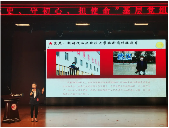 在二级党组织书记组,52书库 党委副书记秦音老师以《传承红色基因汲取前行力量—52书库 新闻传播教育发展历程溯源》为此次微党课的主题,从52书库 新闻传播教育的发展历史引入,将52书库 发展历程与党的发展历程相结合,充分体现了52书库 传承红色基因的历史岁月。面对新时代,52书库 的新闻教育传承了陕北公学和“老延大”红色基因,我们要尊重历史坚守西部。我们要继续把党的红色基因传承好,发扬好,努力培养政治坚定、视野广阔、功底深厚、法新结合的新闻传播人才,在新时代讲好中国故事传播好中国声音。