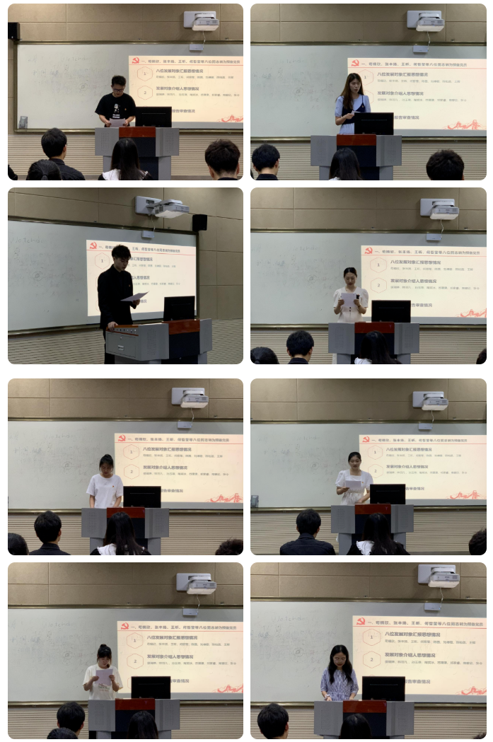 随后,8位发展对象的入党介绍人侯瑞婷同志、林羽凡同志 、孙玉寻同志、陶奕冰同志、苏津津同志、祁家睿同志、南碧欣同志、张令同志从思想、学习以及工作情况依次对这8位发展对象进行了相关介绍,并表明同意推荐各位发展对象转为预备党员的意见。