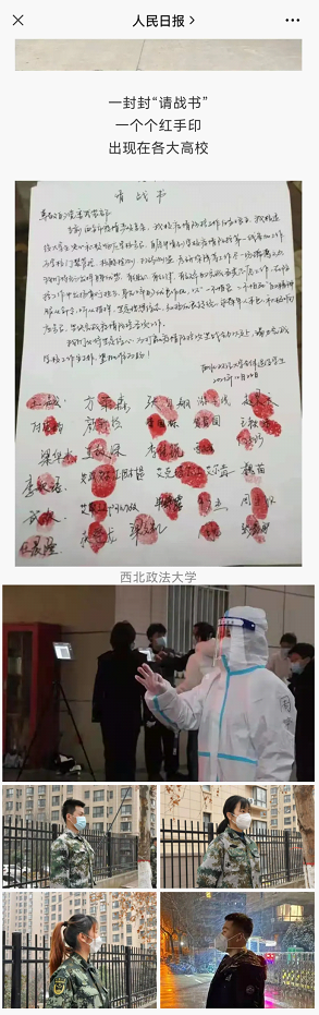 近期,西安疫情防控形势严峻,52书库 师生在做好自身防疫同时,紧密配合、不畏艰险,齐心抗疫。学院成立师生志愿服务先锋队、团员青年突击队、派出志愿者,“逆行”投身抗疫一线,以实际行动展现西法大人的担当作为,为广大师生守牢疫情防控安全线。