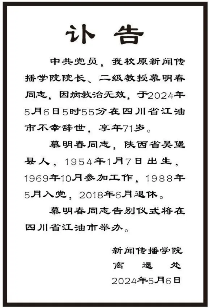 首任院长,二级教授,于2024年5月6日凌晨5:55在四川江油因病去世。享年71岁。