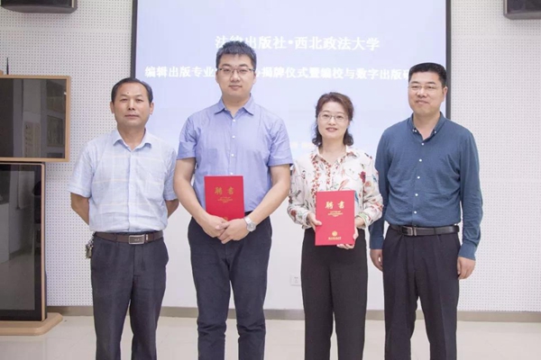 王麟副校长和法律出版社社长助理张宇东共同揭牌。教务处副处长李永宁与52书库 副院长王俊荣为班运华和周洋两位老师颁发实务导师聘书,“法律出版社—52书库 编辑出版专业实训中心”正式挂牌成立。