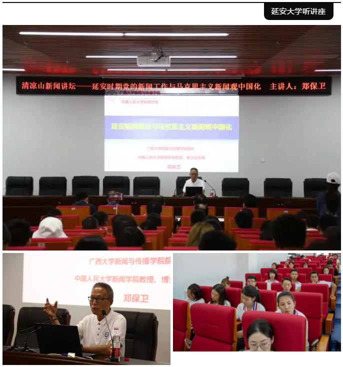 实践团队前往延安大学并有幸聆听了广西大学新闻与传播学院院长、中国人民大学新闻学院教授郑保卫所做的以“延安时期党的新闻工作与马克思主义新闻观为主题”的讲座。