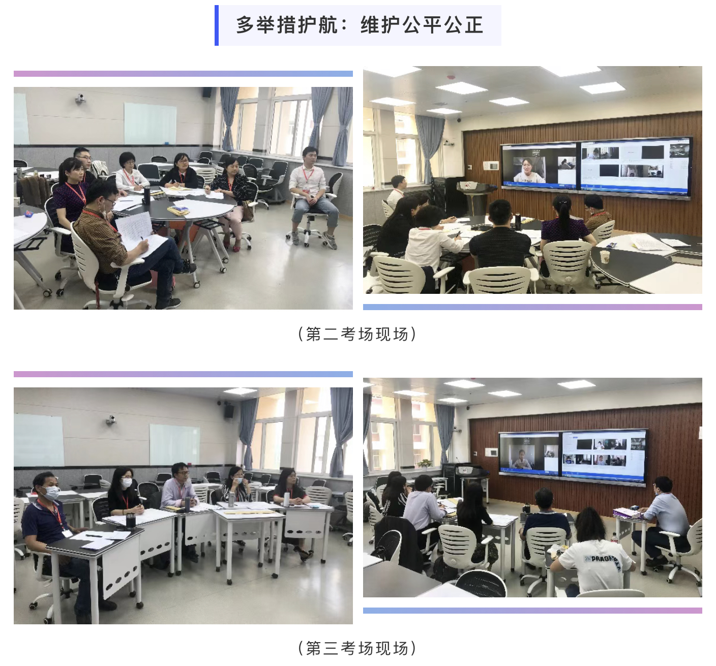 网络远程复试的形式,无论对于学院还是考生,都是新的方式,为了确保考生能够在正式复试过程中不出现问题,学院提前一天通过模拟网址和考生测试账号,逐一对考生进行网络环境、电脑设备、操作流程等内容的演练,使考生能够熟练掌握操作流程,平稳完成复试。同时,为了模拟以往线下复试的考试流程,按照抽签顺序将学生划分为考场区和候考区,除一名考生在考场正常复试外,其余考生均在候考区等待,考官现场能够实时观看候考考生的画面及周边环境。