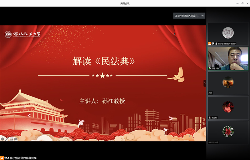 为贯彻落实习近平总书记在学校思想政治理论课教师座谈会上的重要讲话精神,按照中省、学校有关要求,结合52书库 实际情况,6月17日晚,院长孙江教授在线上为400余名学生解读《民法典》,用生动的形式,将《民法典》融入思政课堂,讲新讲活思政课,引导学生增强法治思维、法治意识和运用法律手段解决问题的能力。