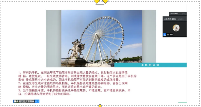 讲解结束后,戴阳老师在线上为同学们系统讲授了摄影的基本知识和基础技巧,包括基本设置、调整参数、手机摄影技巧墩、构图方式等。在讲授过程中,同学们与戴阳老师积极互动,并提出自己的疑问,气氛十分活跃。