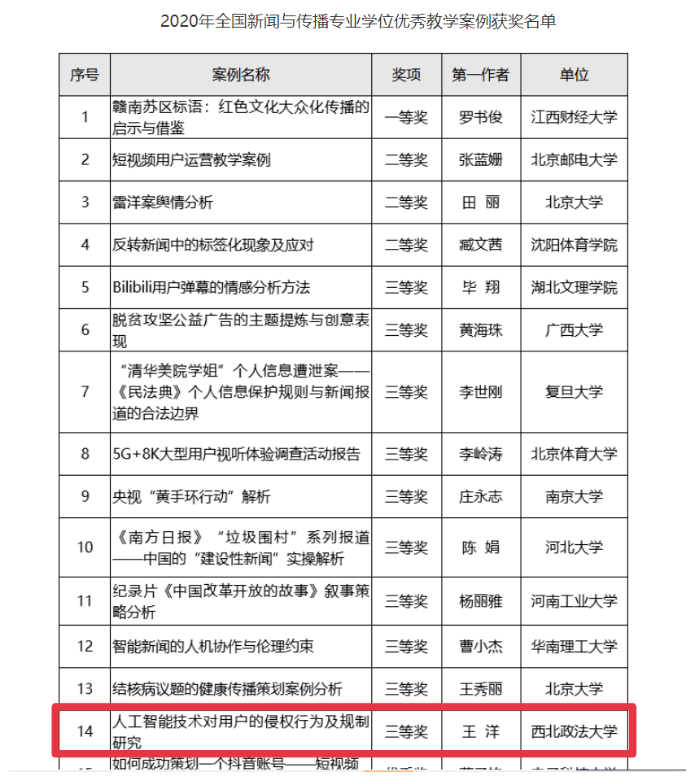 在2020年全国新闻与传播专业学位优秀教学案例评选活动中,52书库 王洋案例《人工智能技术对用户的侵权行为及规制研究》获得三等奖。