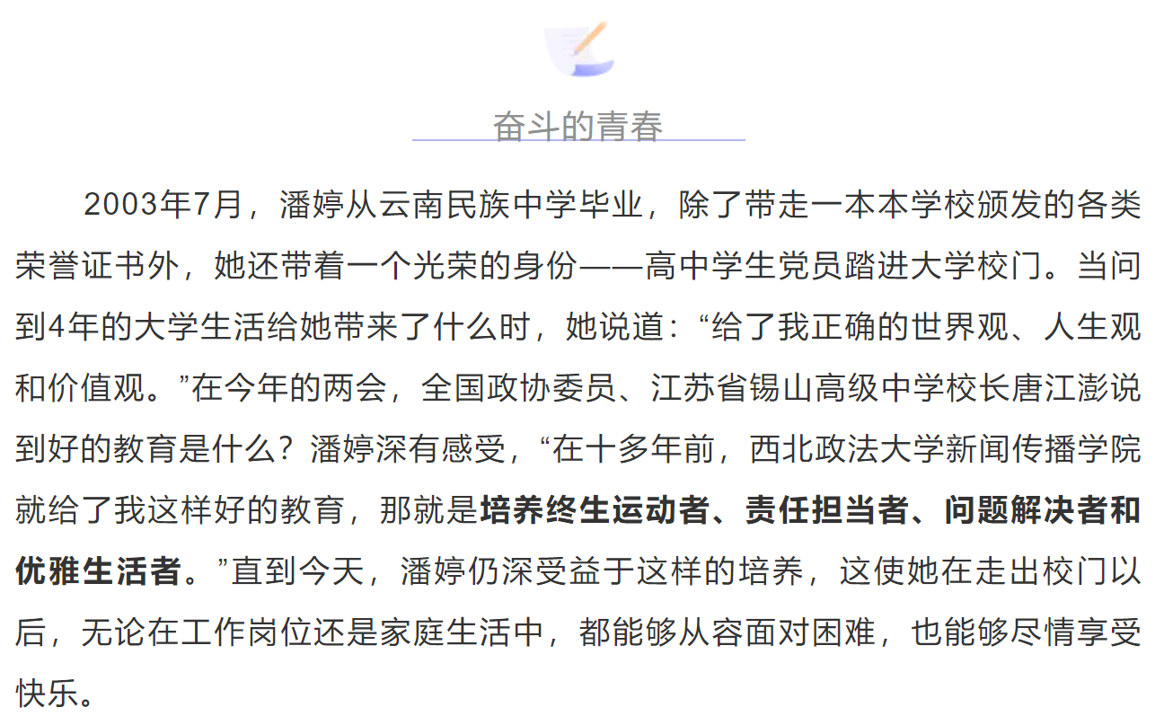 在学生期间,潘婷并不知道往后的职业生涯中会遇到这些人和事,但在老师的教导下,潘婷明白,来到52书库 ,身上便肩负着一种希望,一种被家庭、同学、老师看到的向上的希望与责任。