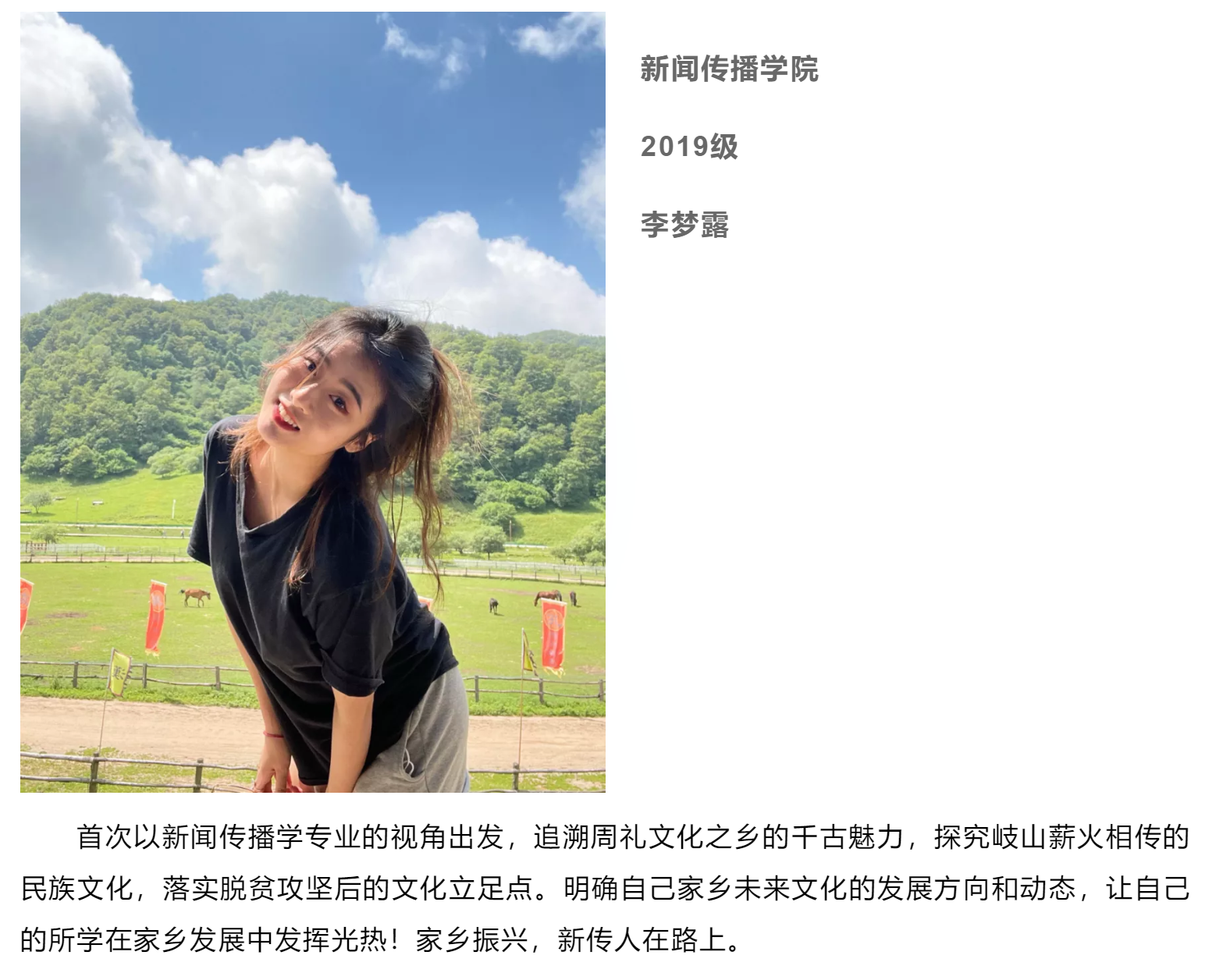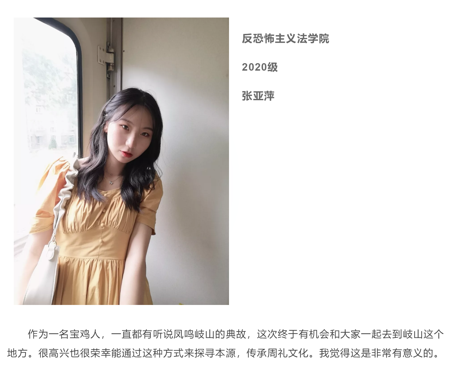 作为一名地地道道的岐山人,很荣幸能够和队伍一起探寻家乡非物质文化遗产的保护工作,将自己所学的法律知识与非遗保护相结合起来,我希望能够运用法律为非物质文化遗产保驾护航!