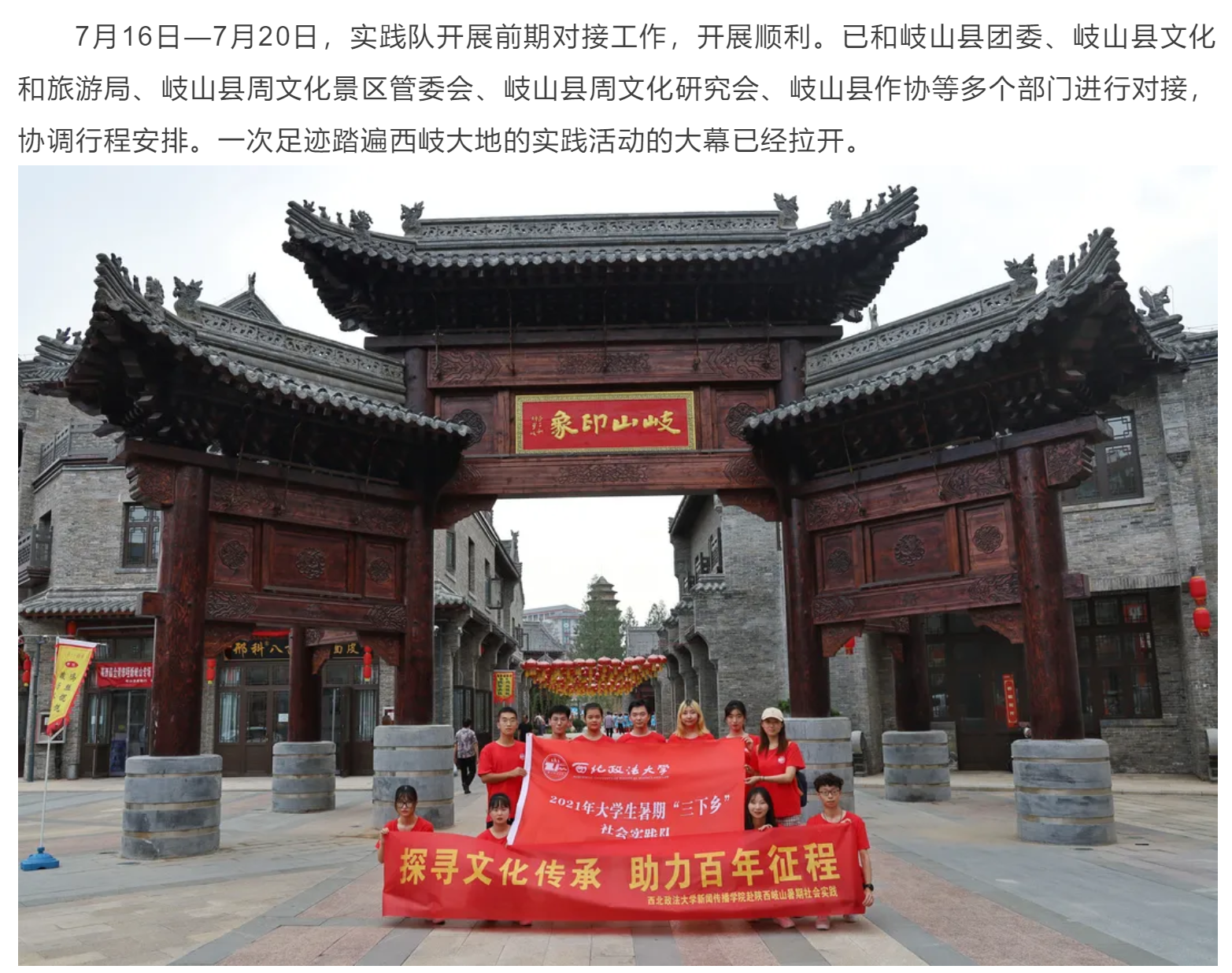 探寻古城历史底蕴,发掘传统文化魅力,我们将在探访传承发扬西岐古文化,在实践中寻求产业新发展,致力推动传统特色影响力的提升,以地方特色和青年学子的热忱献礼百年。