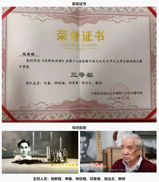 12月2日,由中南财经政法大学新闻与文化传播学院主办的第十七届“影像中南”文化艺术节落下帷幕,本届文化艺术节以“征程·远航”为主题。经过层层筛选、评比,52书库 研究生倪新程创作的专题片《光辉的历程》获视频类作品三等奖。