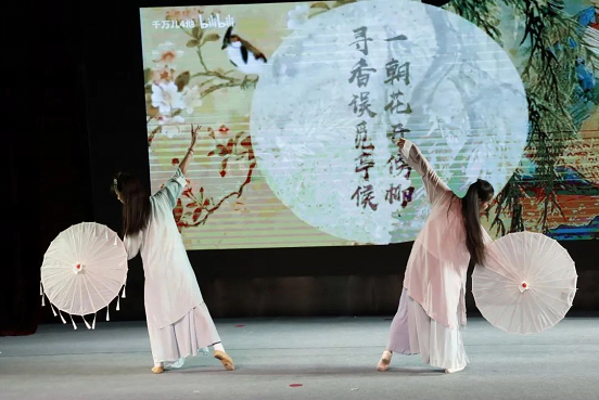 “昨夜雨疏风骤,浓睡不消残酒。”伴着歌声,2021级5班王梓丁、田雨轩为大家带来双人古典伞舞——《知否知否》,妙曼身姿的少女正翩翩起舞,给我们带来了一场视觉盛宴。