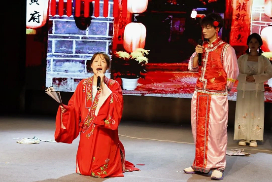 2021级8班张佳乐等带来的小品《四大才子》 演员们精心设计进行角色反串,以“四大才子”文府比武招亲为背景,一个个有料的梗接连抛出,引得大家欢笑连连。